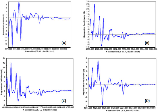 Regression coefficients of the PLS models for (A) CP, (B) NDF, (C) ADF, and (D) DM.