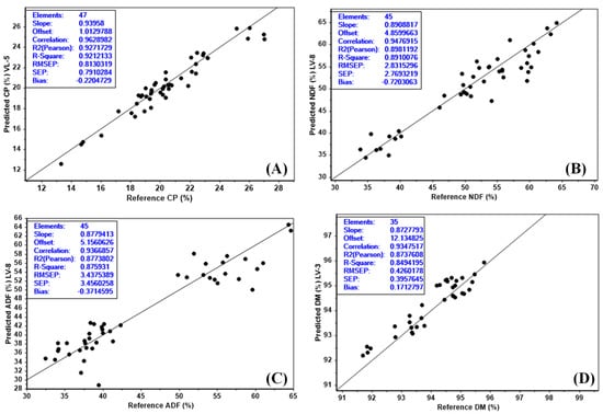 Scatter plots of near-infrared reflectance spectroscopy (NIRS) predicted values vs. reference methods for external cross-validation (black) samples in parameters of (A) crude protein (CP) %, (B) neutral detergent fiber (NDF) %, (C) acid detergent fiber (ADF) %, and (D) dry matter (DM) % in Cratylia argentea.