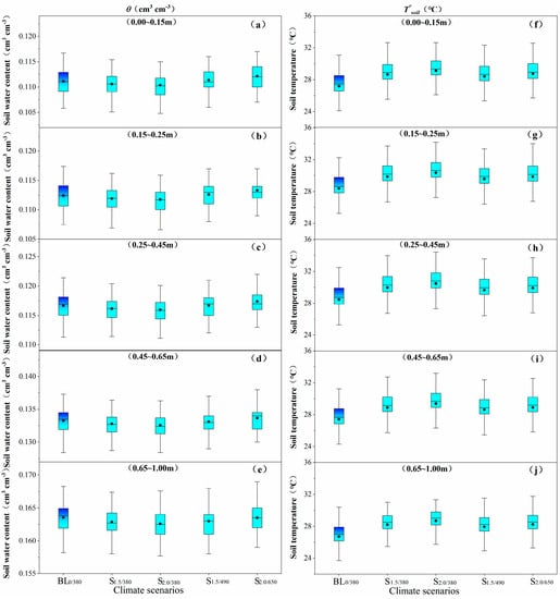 Simulated soil water content (a–e) and soil temperature (f–j) under four future climate scenarios, as well as baseline conditions. BL0/380, ; S1.5/380, ; S2.0/380, ; S1.5/490, ; S2.0/650, .