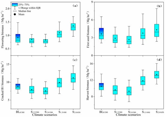 Simulated aboveground biomass of cotton at the flowering (a), first seed (b), cracked B1 (c), and harvest (d) stages in response to four future climate scenarios, as well as baseline conditions. BL0/380, ; S1.5/380, ; S2.0/380, ; S1.5/490, ; S2.0/650, .