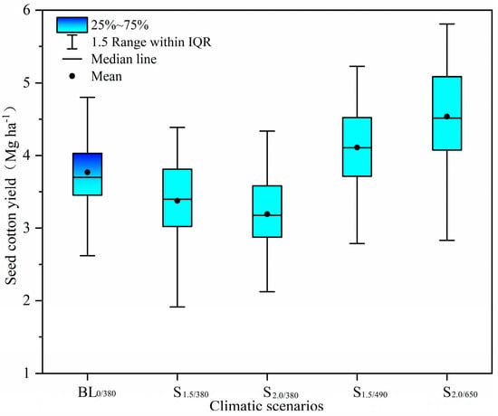 Simulated seed cotton yield under four future climate scenarios, as well as baseline conditions. BL0/380, ; S1.5/380, ; S2.0/380, ; S1.5/490, ; S2.0/650, .