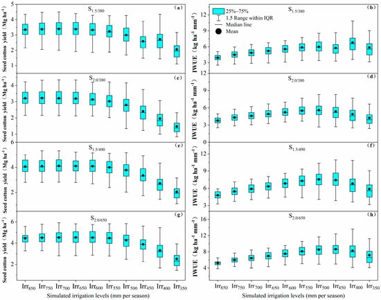 Simulated seed cotton yield and irrigation water use efficiency under different irrigation treatments (a–h) for four future climate scenarios. S1.5/380, ; S2.0/380, ; S1.5/490, ; S2.0/650, . The 25-75% shading—the number from the 25th to the 75th percentile of all values in the data column, in descending order; 1.5 Range with IQR, maximum and minimum values in the non-abnormal range (upper and lower limits); IQR, Inter-Quartile Range. IWUE = Yield/Irrigation amount, Irrigation water use efficiency.