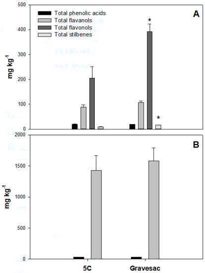 Figure 1 shows the profile of the low-molecular-weight phenolic compounds in grape skins and seeds from two rootstocks in cv. Syrah. In grape skins, the total phenolic acids varied from 18.99 to 19.48 mg kg−1 with no differences between rootstocks. For the total flavanols, the concentration ranged from 88.65 to 106.12 mg kg−1 with no significant differences between rootstocks. In the case of the total flavonols, the values ranged from 205.45 to 392.18 mg kg−1, showing that the Gravesac rootstock had a higher concentration. The same behavior was observed for stilbenes, where Gravesac reached a higher concentration value compared with the 5C rootstock. For the grape skins, the profile of the phenolic compounds can be observed in Table S1.