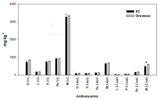 The anthocyanin profile of grape skins shows thirteen anthocyanins; five glucosylated anthocyanins such as delphinidin-3-glucoside, cyanidin-3-glucoside, petunidin-3-glucoside, peonidin-3-glucoside and malvidin-3-glucoside; four acetylated anthocyanins such as delphinidin-3-acetylglucoside, peonidin-3-acetylglucoside, peonidin-3-acetylglucoside and malvidin-3-acetylglucoside; and four coumaroylated anthocyanins, cyanidin-3-p-coumaroylglucoside, petunidin-3-p-coumaroylglucoside, peonidin-3-p-coumaroylglucoside and malvidin-3-p-coumaroylglucoside. In this analysis, there were only differences in malvidin-3-p-coumaroylglucoside with a higher concentration in grape skins from the Gravesac rootstock (Figure 2).