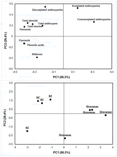 Figure 3 shows the principal component analysis illustrating the relationship between the wines from both rootstocks and the phenolic compounds measured via spectrophotometry and liquid chromatography. PC1 and PC2 accounted for 82.7% of the total variation (PC1, 56.3% and PC2, 26.4%). PC1 was characterized by coumaroylated anthocyanins, flavanols, flavonols, phenolic acids, total anthocyanins, total phenols and total tannins. PC2 was characterized by acetylated anthocyanins, glucosylated anthocyanins and stilbenes. The overall results indicate that the wines from grapes of the rootstock 5C are related with glucosylated anthocyanins, total phenols, total anthocyanins, total tannins, flavanols, flavonols, phenolic acids and stilbenes, whereas the wines from the Gravesac rootstock correlate with acetylated anthocyanins and coumaroylated anthocyanins. The profiles of the low-molecular-weight phenolic compounds and the profile of anthocyanins are shown in Tables S3 and S4.