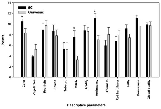 Descriptive sensory analysis of Syrah wine from rootstocks 5C and Gravesac. * denotes significant differences between rootstocks according to ANOVA (p < 0.05).