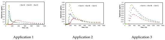 In application 1, breakthroughs of the glyphosate occurred after 100, 312, and 103 h, respectively. It was observed that soil column C showed the greatest glyphosate breakthrough at a peak of 0.7627 g/mL, which was in agreement with the fact that soil C has a lower capacity for sorption than soils A and B. Application 2 had comparatively lower glyphosate concentrations than application 1, with first arrivals in soils A, B, and C occurring at 205 h, 328 h, and 168 h, respectively. Based on the results obtained from glyphosate application 3, it was difficult to determine whether phosphorus in the pre-saturation solution contributed to glyphosate leaching.