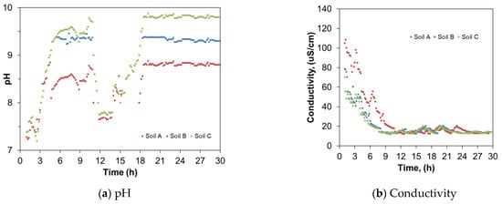 A number of studies found that glyphosate sorption by goethite decreases with increasing pH [37,38] similar to how other phosphonates and phosphate sorption decreases with increasing pH. Additionally, in uniform non-structured soils, such as sandy soils with high hydraulic conductivity and high precipitation rates, glyphosate leaching is prevented by lower sorption capacities. Based on a summary of the three soils, soil B had the lowest effluent glyphosate concentration, which was attributed to (1) lower breakthrough bromide concentrations, (2) lower pH values (Figure 4), and (3) higher electrical conductivity (Figure 4). Therefore, soil B had a lower glyphosate effluent concentration due to its lower pore-water velocity compared to soils A and C.