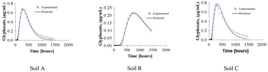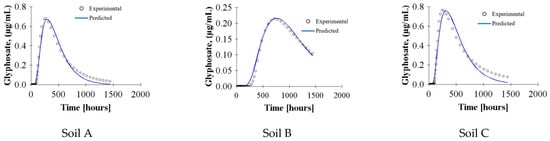 The numerical simulation was conducted using only glyphosate application as a pulse input, since the effluent concentrations of glyphosate were higher in application 1 than in the other two applications. Based on the results obtained using HYDRUS-1D, both equilibrium and non-equilibrium one-site sorption models accurately described glyphosate transport in a loam soil. To describe the data using the equilibrium model, the parameters derived from the batch sorption experiments were = 49.49 mg1−(1/n)Lnkg−1 and 1/n = 0.6289 for soil A, = 76.71 mg1−(1/n)Lnkg−1 and 1/n = 0.7350 for soil B, and = 39.53 mg1−(1/n)Lnkg−1 and 1/n = 0.7400 for soil C. The fitting of this equilibrium model (Figure 6) to the experimental data, taking and 1/n as free adjustable parameters, compared well with the results obtained using the parameters in Table 4.