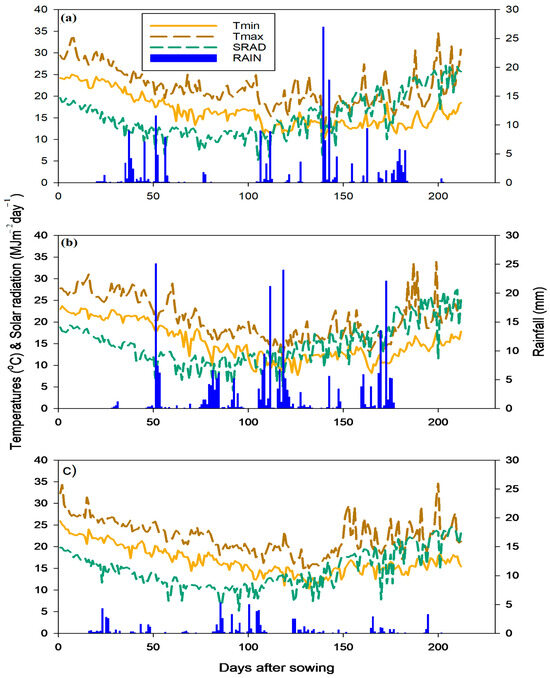 Daily weather data of minimum temperature (Tmin), maximum temperature (Tmax), solar radiation (SRAD), and rainfall for beans during three growing seasons, 2020/2021 (a), 2021/2022 (b), and 2022/2023 (c).