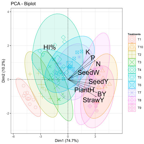 Principal component analysis (PCA) to better understand the variability of yield, yield attributes (loadings), and treatments (scores). The loadings include seed yield (SeedY), straw yield (StrawY), biomass yield (BY), plant height (PlantH), harvest index (HI), seed weight (SeedW), seed content of nitrogen (N), seed content of phosphorus (P), and seed content of potassium (K). The soil treatments (scores) included control, polymer5, polymer10, biochar2.5, compost5, polymer5 + biochar2.5, polymer5 + compost5, polymer10 + biochar2.5, polymer10 + compost5, and biochar2.5 + compost5 for T1, T2, T3, T4, T5, T6, T7, T8, T9, and T10, respectively.