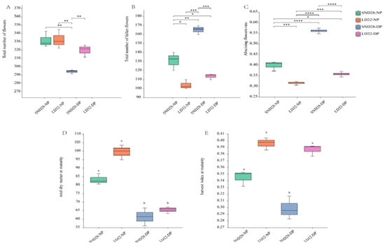 Significant differences were not observed between the total number of opened flowers in LD32 and SND28 plants under normal planting densities. However, significant differences were observed in the number of abscised flowers and in the rate of abscission. Under dense planting, the total number of open flowers of the two soybean cultivars showed a decreasing trend, while the total number of abscised flowers and abscission rate showed an increasing trend. Moreover, the total number of fallen flowers and shedding rate of SND28 were higher than those of LD32 (Figure 1A–C). Increased planting density had a significant impact on the total dry matter mass at maturity of both LD32 and SND28, resulting in a decrease compared with the normal planting density. Moreover, LD32 exhibited a greater total dry matter mass than SND28 when grown under dense planting (Figure 1D). The harvest index also indicated that increased planting density led to a decrease in the harvest index for both varieties, with SND28 experiencing a significant decrease compared with LD32 (Figure 1E). These findings suggest that LD32 demonstrated better tolerance than SND28, as shown by the abscission rate, total dry matter mass at maturity, and harvest index under high density.
