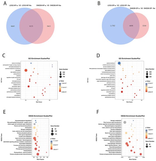 Results of the transcription analysis of different groups. (A) Comparison of the number of DEGs in abscised and non-abscised flowers of SND28 (SND28-NP-A vs. SND28-NP-NA), and abscised and non-abscised flowers of LD32 (LD32-NP-A vs. LD32-NP-NA) at a normal planting density. (B) Comparison of the number of DEGs in abscised and non-abscised flowers of SND28 (SND28-DP-A vs. SND28-DP-NA), and abscised and non-abscised flowers of LD32 (LD32-DP-A vs. LD32-DP-NA) under dense planting. (C) GO enrichment bubble plots of DEGs in abscised and non-abscised flowers of SND28 (SND28-NP-A vs. SND28-NP-NA), and abscised and non-abscised flowers of LD32 (LD32-NP-A vs. LD32-NP-NA). (D) GO enrichment bubble plots of DEGs in abscised and non-abscised flowers of SND28 (SND28-DP-A vs. SND28-DP-NA) and LD32 abscised and non-abscised flowers (LD32-DP-A vs. LD32-DP-NA) under dense planting conditions. (E) KEGG enrichment bubble plots of DEGs in abscised and non-abscised flowers of SND28 (SND28-NP-A vs. SND28-NP-NA) and LD32 (LD32-NP-A vs. LD32-NP-NA). (F) KEGG enrichment bubble plots of DEGs in abscised and non-abscised flowers of SND28 (SND28-DP-A vs. SND28-DP-NA) and LD32 (LD32-DP-A vs. S16) under dense planting.