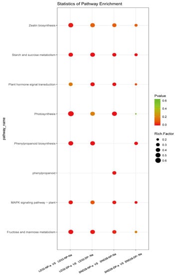 In total, 4698 DEGs were identified in the abscised versus non-abscised flowers of SND28 (SND28-DP-A vs. SND28-DP-NA) and LD32 (LD32-DP-A vs. LD32-DP-NA) under high-density planting (Figure 2B). The common DEGs were subjected to GO enrichment analysis, and 357 pathways were found to be enriched, including sucrose metabolic processes, sucrose transport, and other GO pathways (Figure 2D). These DEGs were subjected to KEGG analysis (Figure 2F), and 28 pathways were found to be enriched in these genes. They included metabolic pathways such as phenylpropanoid biosynthesis, MAPK signaling, starch and sucrose metabolism, and phytohormone pathways. The results showed that both abscised and non-abscised flowers were affected by the accumulation and metabolism of sugars under different planting densities, while the MAPK signaling pathway was equally involved in the process of flower abscission. Different planting densities affected the metabolic regulation of the photosynthetic pathway.