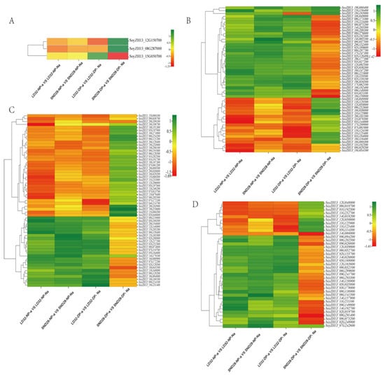 Heat map analysis of common genes expressed in the common enrichment pathways in abscised and non-abscised flowers of LD32 and SND28 under different densities. (A) Heat map of the expression of three genes in the photosynthetic pathway. (B) Heat map of the expression of 51 genes in the phenylalanine metabolic pathway. (C) Heat map of the expression of 59 genes in the MAPK metabolic pathway. (D) Heat map of the expression of 37 genes in the sugar and starch metabolic pathways.