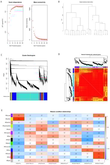 WGCNA analysis. (A) Determination of the soft thresholds, where the abscissa represents the soft threshold. Left: the ordinate corresponds to the index of the scale-free network model; right: the average degree of linkage of each soft threshold. (B) Clustering dendrogram of the samples and the corresponding tissue information. The gene cluster tree is based on the Euclidean distance. (C) Gene cluster dendrograms and detection of the modules. (D) Gene expression heat map. (E) Heat map of the modules and the samples’ correlations.