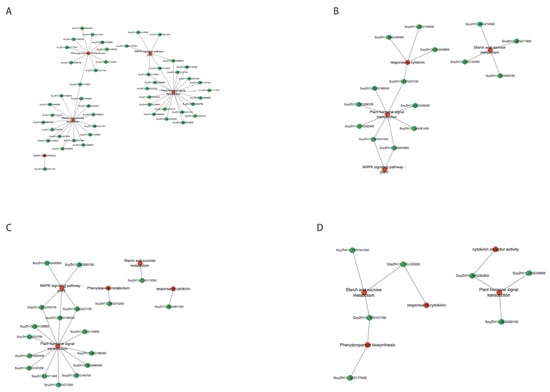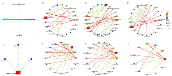 Further investigations with correlation network plots (|r| >0.90) were performed for the common DEGs and DEMs in the abscised and non-abscised flowers of SND28 (SND28-NP-A vs. SND28-NP-NA) and LD32 (LD32-NP-A vs. LD32-NP-NA) under normal planting densities, and those of SND28 (SND28-DP-A vs. SND28-DP-NA) and LD32 (LD32-DP-A vs. LD32-DP-NA) under dense planting. The correlation analysis showed that the DEGs in the photosynthesis pathways (Figure 8A,E), sugar and starch metabolic pathways (Figure 8B,F), the phenylalanine pathways (Figure 8C,G), and the MAPK signaling pathways (Figure 8D,H) play direct or indirect regulatory roles in the metabolism of key DEMs in LD32 and SND28 under different planting densities.