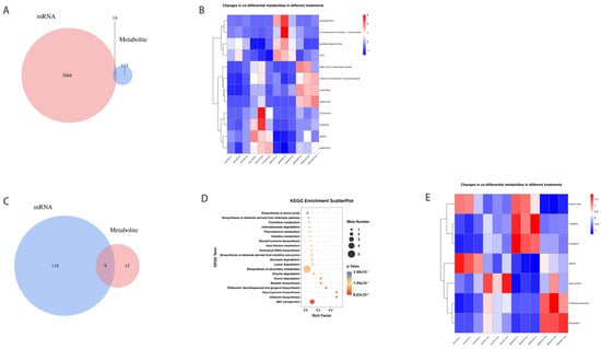 The samples were subjected to metabolite extraction using the protein precipitation method using an organic reagent, and quality control samples (QC) were prepared simultaneously. The samples were subjected to untargeted metabolomic analysis using a Q Exactive high-resolution mass spectrometer (Thermo Fisher Scientific, Waltham, MA, USA) with LC-MS/MS technology to acquire data in both the positive ion (pos) and negative ion (neg) modes to explore the metabolomic composition and biological functions within the samples. Raw data from the mass spectrometry were converted to readable mzXML data using ProteoWizard’s MSConvert software(3.0.230xx). Peak extraction was performed using XCMS software (3.22.0), and the quality of the peak extraction was controlled. The extracted material was annotated with the total number of ions using CAMERA and then identified at the first level using MetaX software (1.4.17). Information from the primary mass spectrometry examination was used for identification, and information from the secondary mass spectrometry examination was matched with an in-house standard database. Candidate identification substances were used for the annotation of the metabolites, using HMDB, KEGG, and other databases to explain the physicochemical properties and biological functions of the metabolites. Quantitative screening of the DEMs was performed using MetaX software [29]. Depending on the contribution to the degree of variance of the PLS-DA model (VIP) of the first two principal components of the multivariate analysis, the partial least squares method-discriminant analysis (PLS-DA) model, and the univariate analysis; the fold change and t-test (Student’s t-test) results were used to screen for DEMs. The screening criteria for DEMs between groups were based on an extensive targeted metabolomic analysis, and DEMs were defined as follows: a ratio of ≥2 or a ratio ≤ ½, a q of value < 0.05 (or p < 0.05), and a VIP of ≥1 [30]. Finally, Pearson’s correlation analysis was used to integrate the metabolomic and transcriptomic analyses.