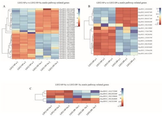 Heat map of DEGs of LD32 enriched in the zeatin pathway. (A) Heat map analysis of DEGs between LD32−NP−A and LD32−NP−NA in the zeatin pathway. (B) Heat map of DEGs between LD32−NP−A and LD32−DP−A in the zeatin pathway. (C) Heat map of DEGs between LD32−NP−NA and LD32−DP−NA in the zeatin pathway.