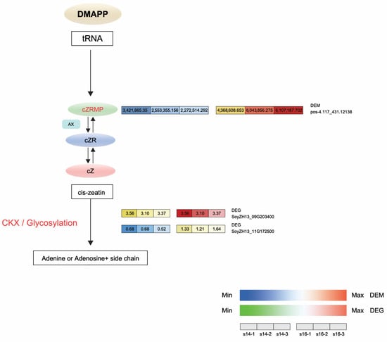 Expression profiles of DEGs and DEMs associated with the biosynthesis and metabolism of zeatin in the comparison between LD32-NP-NA and LD32-DP-NA. cZ, cis-zeatin; DMAPP, dimethylallyl pyrophosphate; AK, adenosine kinase causing the phosphorylation of riboside cZR; CKX, cytokinin oxidase/dehydrogenase leading to the free base of cZ to adenine or adenosine catabolism.