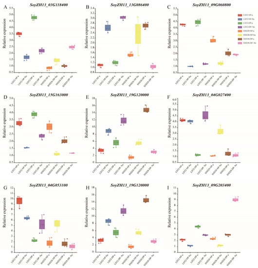 Validation of DEGs in different comparisons by qRT-PCR. (A) SoyZH13_03G118400 expression levels in different comparisons. (B) SoyZH13_13G086400 expression levels in different comparisons. (C) SoyZH13_09G060800 expression levels in different comparisons. (D) SoyZH13_15G163000 expression levels in different comparisons. (E) SoyZH13_19G120000 expression levels in different comparisons. (F) SoyZH13_04G027400 expression levels in different comparisons. (G) SoyZH13_04G053100 expression levels in different comparisons. (H) SoyZH13_19G120000 expression levels in different comparisons. (I) SoyZH13_09G203400 expression levels in different comparisons.