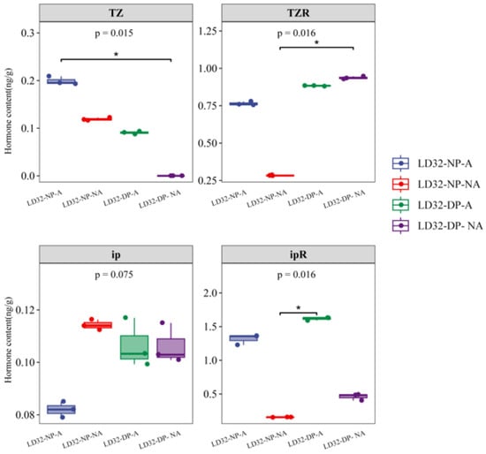 Determination of the hormone content in abscised and non-abscised flowers of LD32 under different planting densities. * indicate p < 0.05.