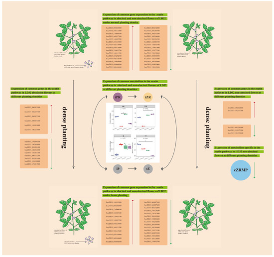 In the DEM analysis, the levels of cis-zeatin riboside monophosphate (CZRM) detected in LD32 non-abscised flowers under dense planting were significantly higher than in non-abscised flowers under normal conditions. In the zeatin biosynthesis pathway, cis-zeatin riboside monophosphate (CZRM) induces the phosphorylation of the riboside cZR through the enzyme adenosine kinase (AK). Furthermore, CZRM was converted to cis-zeatin (cZ) by the enzymes cytokinin phosphoribosyl hydrolase (LOG) and cytokinin oxidase/dehydrogenase (CKX), leading to the breakdown of the free base cZ into adenine or adenosine. The differential gene cytokinin dehydrogenase 6 and the differential metabolite CZRM were downregulated in non-abscised flowers of LD32 under both normal densities and dense planting (LD32-NP-NA vs. LD32-DP-NA). This indicated that the levels of CKX6 (SoyZH13_09G203400 and SoyZH13_11G172500) (Figure 9C) and CZRM were higher in normal flowers of LD32 under dense planting than under the normal planting density. The content in non-abscised flowers of LD32 was higher than that in abscised flowers of LD32 under normal planting densities. Changes in the number of non-abscised flowers of LD32 under dense planting and the lack of significant differences in the number of non-abscised flowers of LD32 under the normal planting density were hypothesized to be related to the co-regulation of CKX6 and CZRM in the zeatin biosynthesis pathway (Figure 10).