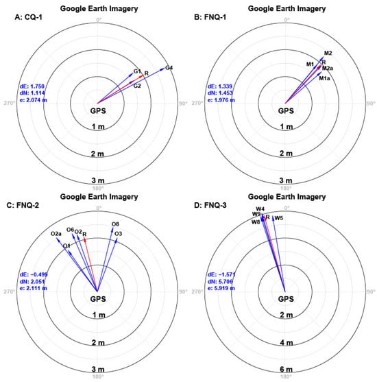Representation of horizontal positional misfit vectors (in WGS84 UTM) between GNSS (coordinate epoch 1/2023 displayed in a GDA2020 epoch) and GE (2016 in CQ-1 and 2021 in FNQs) coordinates of ground control points on four farms: ((A) CQ-1, (B) FNQ-1, (C) FNQ-2, and (D) FNQ-3). Blue and red arrows are individual and mean misfit vectors, respectively.