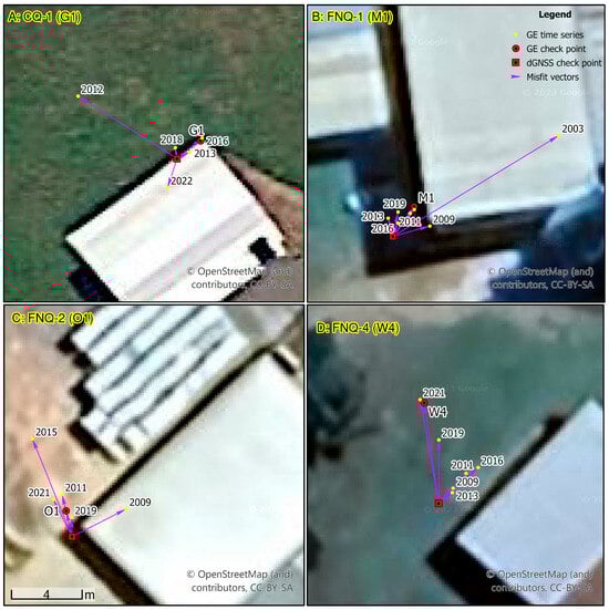 Misfit vectors calculated from the GNSS GDA2020 assessed the location of the GCP and Google Earth images over five years at four farm sites. Vectors are displayed in 2016 for the Google Earth image for (A) and the 2021 image for (B), (C), and (D), respectively.