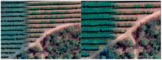 The least squared approximation method for 2D conformal transformation was used in the estimation of four transformational parameters to align GNSS data with GE web imagery. For all sites, the scale factor was unity, and the rotational value was near zero (with average values of s: 0.9999 and : 0.0273). A simple mean shift vector is, therefore, recommended to translate GNSS data for display on GE web imagery. For example, for the FNQ-2 orchard (with row-to-row spacing of 8 m), a shift of −0.499 m east and 2.051 m north was applied for the alignment of GNSS data acquired on 21 August 2022 from a moving vehicle with 2021 GE web imagery (Figure 6).