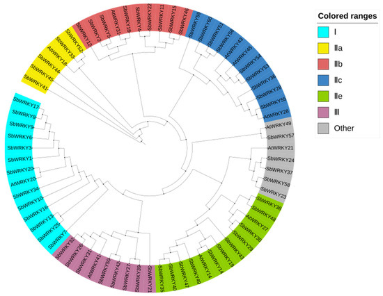 We downloaded the protein sequences of the Arabidopsis thaliana WRKY transcription factor family from TAIR (https://www.arabidopsis.org/index.jsp (accessed on 15 June 2023)). After aligning the SbWRKYs using Mafft software, we constructed a phylogenetic tree using Iqtree. The classification method of Arabidopsis thaliana was used, and neighbor joining (NJ) was used with 1000 replicate settings.