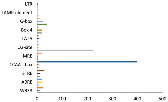 Cis-regulatory elements, which are normally confined to the target gene’s 5′ upstream (promoter) sequence, are binding sites on target genes for transcriptional control by transcription factors. In order to look at the cis-regulatory components of the stress response, we sent the 2000 bp area upstream of each SbWRKY translation start point to PlantCARE. Figure 5 displays a total of 22 stress response components, including TATC-box (cis-regulatory components involved in the gibberellin response), ACE (cis-regulatory components involved in the light response), W Box (WRKY TFs-specific binding region), LTR (cis-regulatory components involved in the low-temperature response), TCA elements (cis-regulatory components involved in the salicylic acid reaction), SARE (a cis-regulatory element involved in salicylic acid reaction), AuxRR-core (a cis-regulatory element that participates in the growth hormone reaction), G-box (a cis-regulatory element that participates in the light reaction), CGTCA motif (a cis-regulatory element that participates in the meja reaction), TGCA motif (a cis-regulatory element that participates in cis-regulatory element), TGACG motif (a cis-regulatory element that participates), Gibberellin response element gare motif, wound response element WUN motif, MYB binding site linked to drought induction, and MYB binding site linked to light response MRE motif. There is at least one cis-regulatory component linked to the stress response in all SbWRKYs. Among them, (212, 20%) were ABRE-acting elements, which were the most abundant among the 15 cis-elements, suggesting that SbWRKY TFs play a role in the ABA pathway.