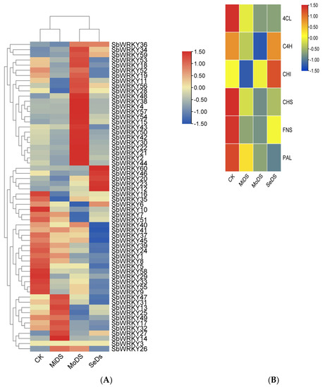 The expression trends of SbWRKYs and key enzyme genes under various drought stresses were calculated using the FPKM values of WRKYs expression in the transcriptome sequencing results of S. baicalensis, and a heat map of the expression of SbWRKY TFs and key enzyme genes was generated (Figure 7) [40]. Under mild drought stress, SbWRKY14, SbWRKY26, SbWRKY45, SbWRKY47, SbWRKY6, ScWRK7, SbWRKY13, SbWRKY49, and SbWRKY25 were more strongly expressed than they were in the CK group. Under mild drought stress, 24 SbWRKYs shown an increase (FPKM > 1) in expression level. Different SbWRKYs were highly expressed under various treatments, with 24 SbWRKYs showing an increase in expression level under moderate drought stress (FPKM > 1) compared to only 5 SbWRKYs showing an increase and 20 SbWRKYs declining under severe drought stress (FPKM < 1). With the exception of CHI, whose expression level was increased under extreme drought stress, all the major enzyme genes showed less expression under drought stress relative to those in the CK group. These findings suggested that the SbWRKYs and important enzyme genes were involved in the stress response to drought.