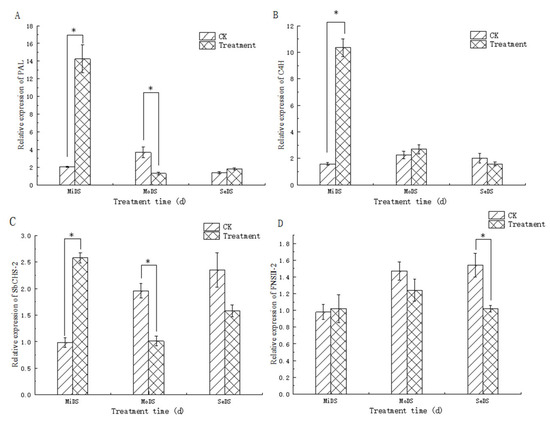 Effect of drought stress on the expression levels of PAL, C4H, SbCHS-2, and FNSII-2. Each value represents the mean (n = 3). * indicates that the difference between the CK and treatment groups was significant, p < 0.05.
