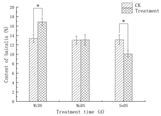 Effect of drought stress on baicalin content. Each value represents the mean (n = 3). * indicates that the difference between CK and treatment groups was significant, p < 0.05.