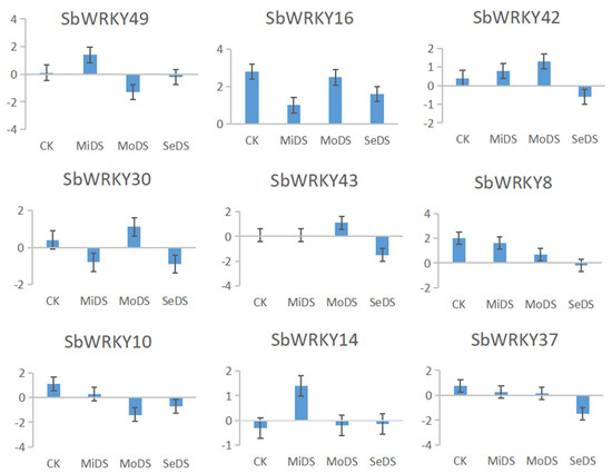 3.6. SbWRKYs and Key Enzyme Genes Expression Analysis under Drought Stress