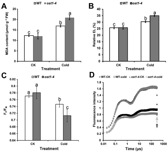 Physiological change of ost1-4 mutant and WT Arabidopsis under cold stress. (A) MDA content; (B) relative EL; (C) FV/FM; (D) OJIP curve; CK = control; cold = cold treatment; WT = wild type; ost1-4 = ost1-4 mutant line. Means with the same letters represent no significant difference (p > 0.05).