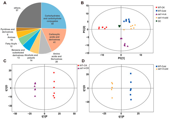 Total statistical analysis of the metabolite profiles. (A) classification statistics; (B) PCA analysis; (C) OPLS-DA analysis between ost1-4 mutant and WT under normal condition; (D) OPLS-DA analysis between ost1-4 mutant and WT under cold stress. The R2X value of the PCA model was 52.3%, and all the samples from both genotypes fall inside the Hotelling’s T2 tolerance ellipse which represents 95% confidence limit. CK = control; cold = cold treatment; WT = wild type; ost1-4 = ost1-4 mutant line.