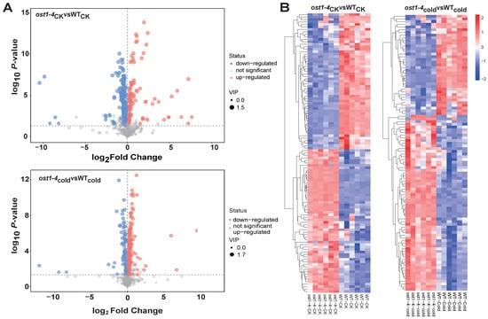 SDMs analysis between ost1-4 mutant and WT under different conditions. (A) volcano plot of the metabolite; (B) Hierarchical clustering analysis for the SDMs. The relative metabolite content was depicted with color scale. Red means upregulated, blue means downregulated. CK = control; cold = cold treatment; WT = wild type; ost1-4 = ost1-4 mutant line.