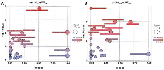 Metabolome view map of significant metabolic pathways identified between ost1-4 mutant and WT. (A) Significant pathways between different genotypes under normal condition; (B) Significant pathways between different genotypes after cold treatment. The x-axis represents pathway enrichment, and the y-axis represents pathway impact. Large sizes and dark colors represent major pathway enrichment and high pathway impact values, respectively. CK = control; cold = cold treatment; WT = wild type; ost1-4 = ost1-4 mutant line.