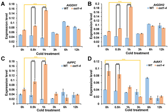 Gene expression in ost1-4 mutant and WT plant after cold treatment. WT = wild type; ost1-4 = ost1-4 mutant line. *** = significant different (p < 0.01). (A) Relative expression of AtGDH1; (B) Relative expression of AtGDH2; (C) Relative expression of AtPPC; (D) Relative expression of AtAK1.