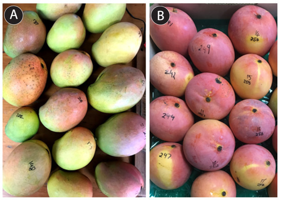 Mature fruit of the mango cultivars (A) Kensington Pride and (B) Calypso.