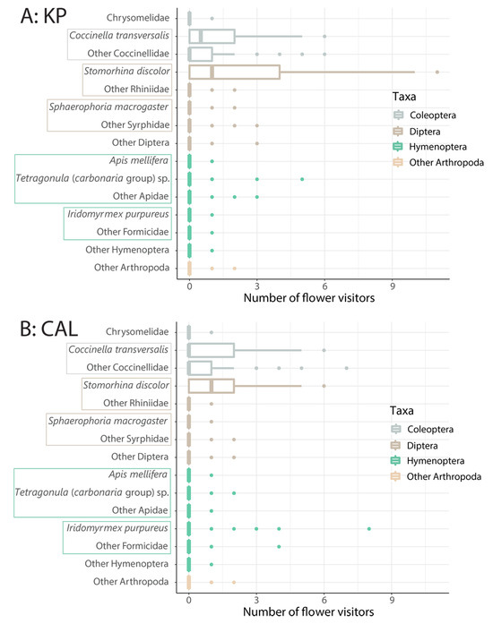 Number of flower visitors on (A) Kensington Pride and (B) Calypso mango flowers, recorded as the mean of three 5-minute periods in a 1 m3 section during three days at peak flowering (n = 72). Boxes around the y-axis labels indicate the family affiliation of each flower visitor species. Medians are presented with the 25th and 75th percentiles (boxes), maxima (whiskers), and outliers.