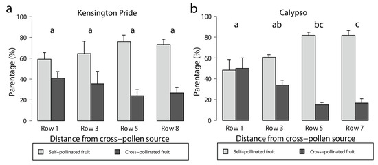 Percentages of self-pollinated and cross-pollinated (a) Kensington Pride and (b) Calypso mango fruit at different numbers of rows from a cross-pollen source. Fruit were sampled along transects, starting at trees adjacent to another cultivar (Row 1) and ending in the middle row of a single-cultivar block (Row 7 or 8). Means (+SEs) for cross-parentage with different letters between rows within a cultivar are significantly different (determined via a one-way ANOVA and Tukey’s HSD test; p ≤ 0.05, n = 6).