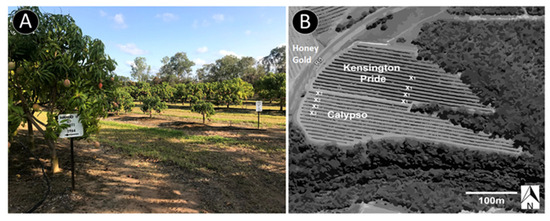 We performed the study, which commenced in August 2019, in a commercial mango orchard (25°8′57″ S, 152°22′32″ E) near Childers, Queensland, Australia. The orchard contained single-cultivar blocks of the cultivars Kensington Pride, Calypso, and Honey Gold. We conducted the study in a 16-row-wide block of Kensington Pride and a 13-row-wide block of Calypso that were planted next to each other (Figure 4). The Kensington Pride and Calypso trees were 6 years old, and the tree spacing was 9 m between rows and 4 m within rows. A block of Honey Gold trees was planted on the other side of a road in 2019, approximately 40 m away. Natural forest surrounded two sides of the orchard (Figure 4). No honeybee (Apis mellifera, Linnaeus, 1758) or stingless bee (Tetragonula spp., Moure, 1961) hives were introduced into the orchard.
