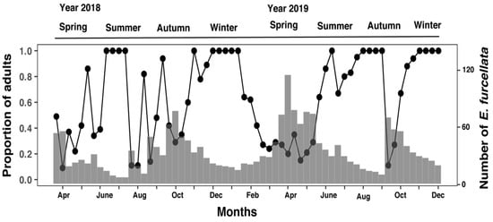 The 21-month-long seasonal survey showed a bimodal E. furcellata population distribution in a year (Figure 2). The first mode started in March, peaked in April, and ended in May (Figure 2). The second mode started in September, peaked in October, and ended in November (Figure 2). The population density sharply declined in mid-July, late November 2018, and mid-September 2019, and only adults were found during these periods (Figure 2). The proportions of adults showed an opposite pattern to population dynamics: proportions of adults during these peak population times were lower (Figure 2). The adult population exhibited a consistent distribution pattern during specific time periods. For instance, from late June to late July 2018 (summer), early December to late January 2018 (winter), mid-August to mid-September 2019 (autumn), and mid-November to mid-December 2019 (winter), the proportion of adults remained at 100%.