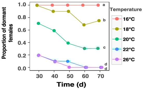 Proportion of dormant E. furcellata females in response to temperature (16 °C, 18 °C, 20 °C, 22 °C, or 26 °C) over 70 d. See Methods for statistical analysis. Multiple mean comparison was adjusted by Tukey’s HSD. Different lower-case letters next to the temperature lines denote significant difference at α = 0.05.