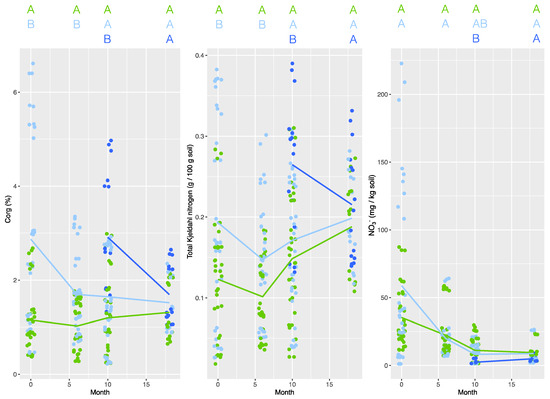 Evolution of organic carbon, total Kjeldahl nitrogen, and nitrate concentrations in the soils monitored over the study period, with samplings at 0, 6, 10, and 18 months (x-axis). Treatments are color-coded such that control = green, one application = light blue, two applications = dark blue. Colored lines indicate the mean value for each treatment and sampling moment. Letters at top indicate result of the Tukey HSD test, whereas different letters indicate statistically significant (p < 0.05) differences between treatments. Consult Table S2 for details of the statistical test results.