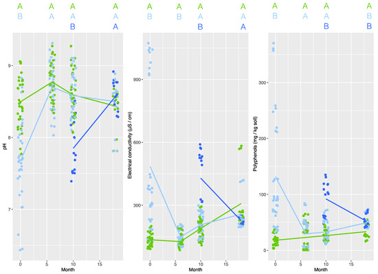 Evolution of pH, electrical conductivity, and polyphenol concentrations in the soils monitored over the study period, with samplings at 0, 6, 10, and 18 months (x-axis). Treatments are color coded such that control = green, 1 application = light blue, 2 applications = dark blue. Colored lines indicate the mean value for each treatment and sampling moment. Letters at top indicate results of the Tukey HSD test, whereas different letters indicate statistically significant (p < 0.05) differences between treatments. Consult Table S2 for details of the statistical test results.