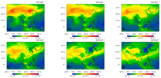 Surface O3 mixing ratio for 2010 at (a) January, (b) February, (c) March, (d) April, (e) May, (f) June, (g) July, (h) August, (i) September, (j) October, (k) November, and (l) December.